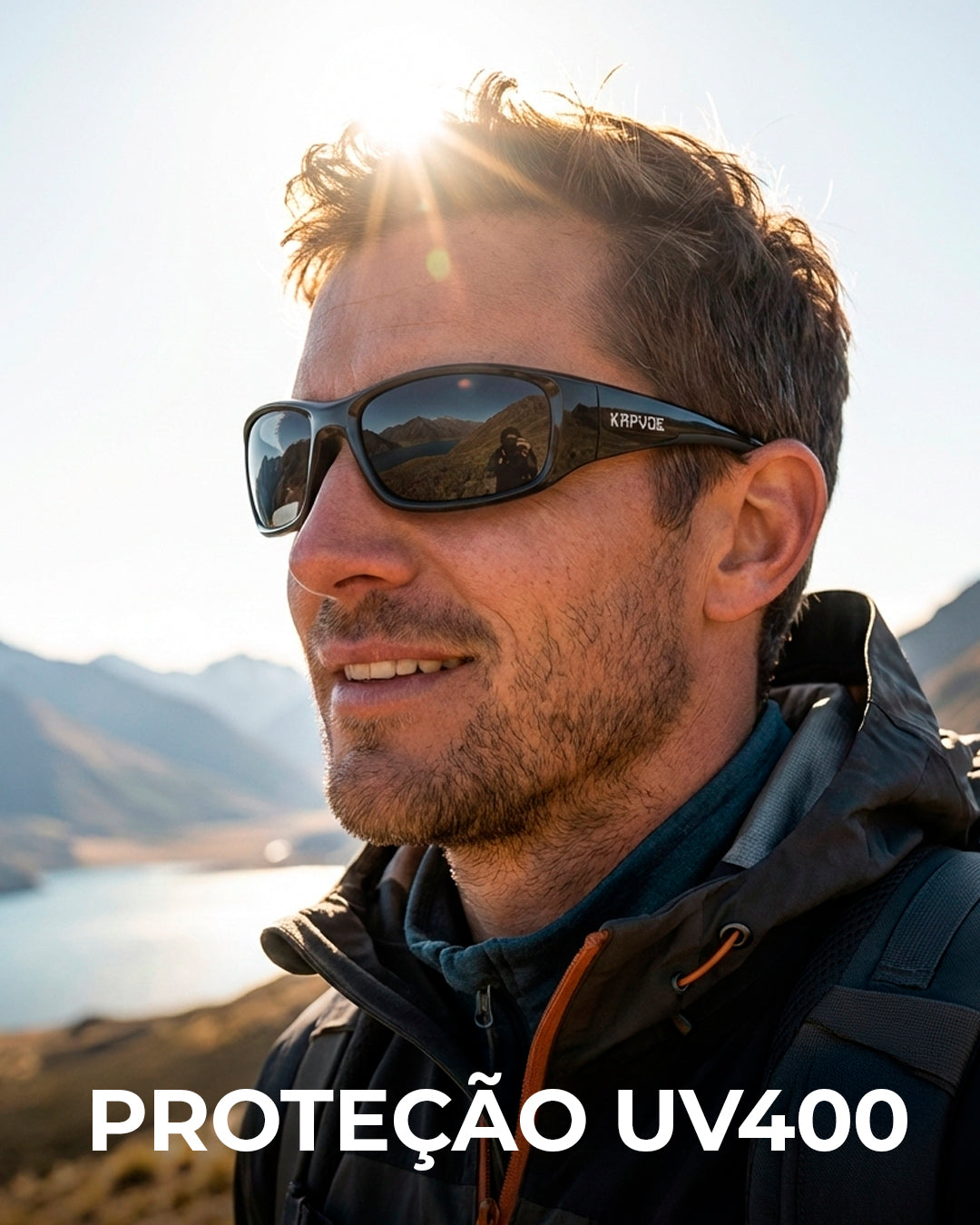 As lentes polarizadas com revestimento filtrante reduzem o brilho refletido e aumentam a nitidez, facilitando a leitura do ambiente em água, estrada ou trilha.