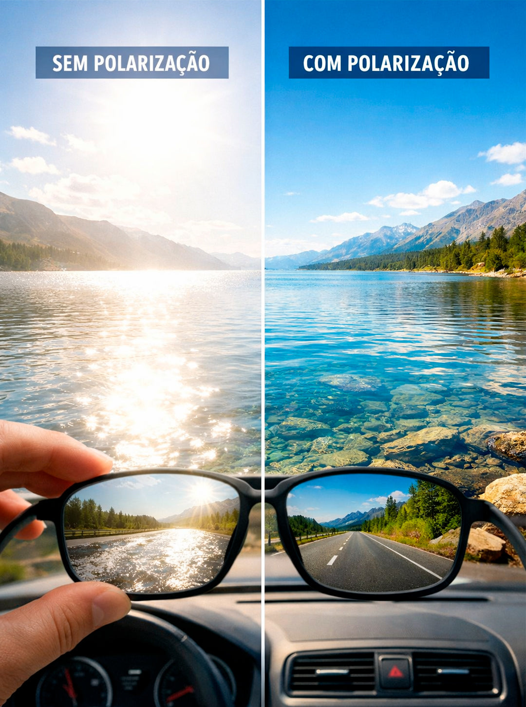A lente única polarizada reduz reflexos intensos e amplia o campo de visão, oferecendo leitura visual mais contínua e precisa em ambientes externos.