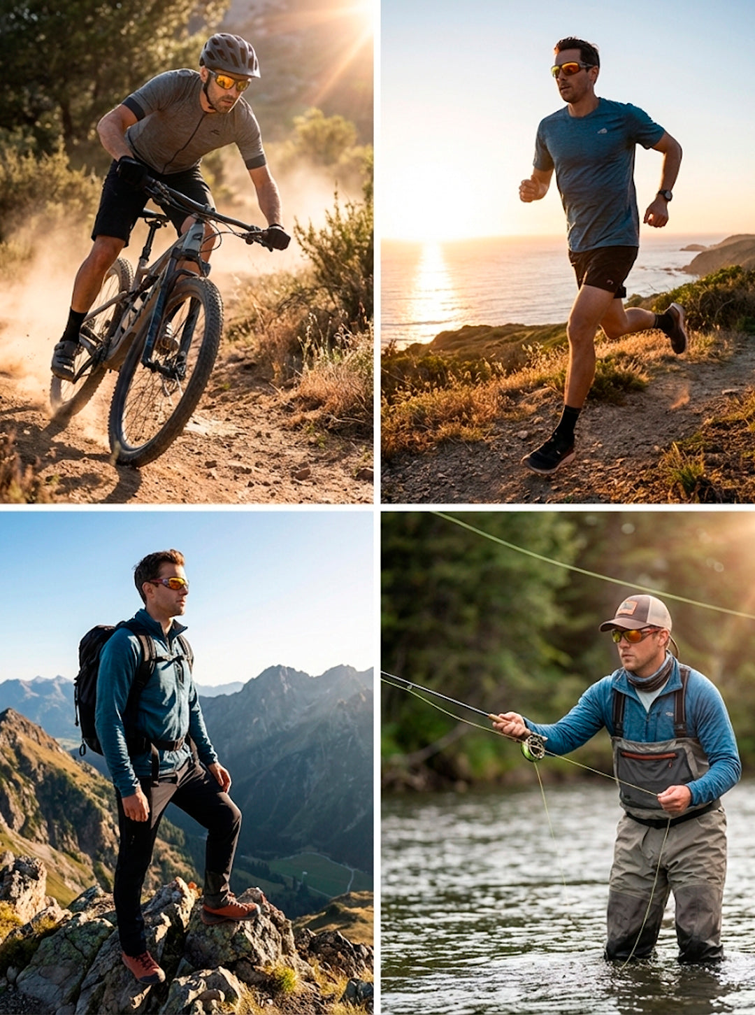 Indicado para ciclismo, corrida, direção, pesca, trilhas e esportes outdoor, adaptando-se a diferentes cenários com foco em controle e estabilidade.