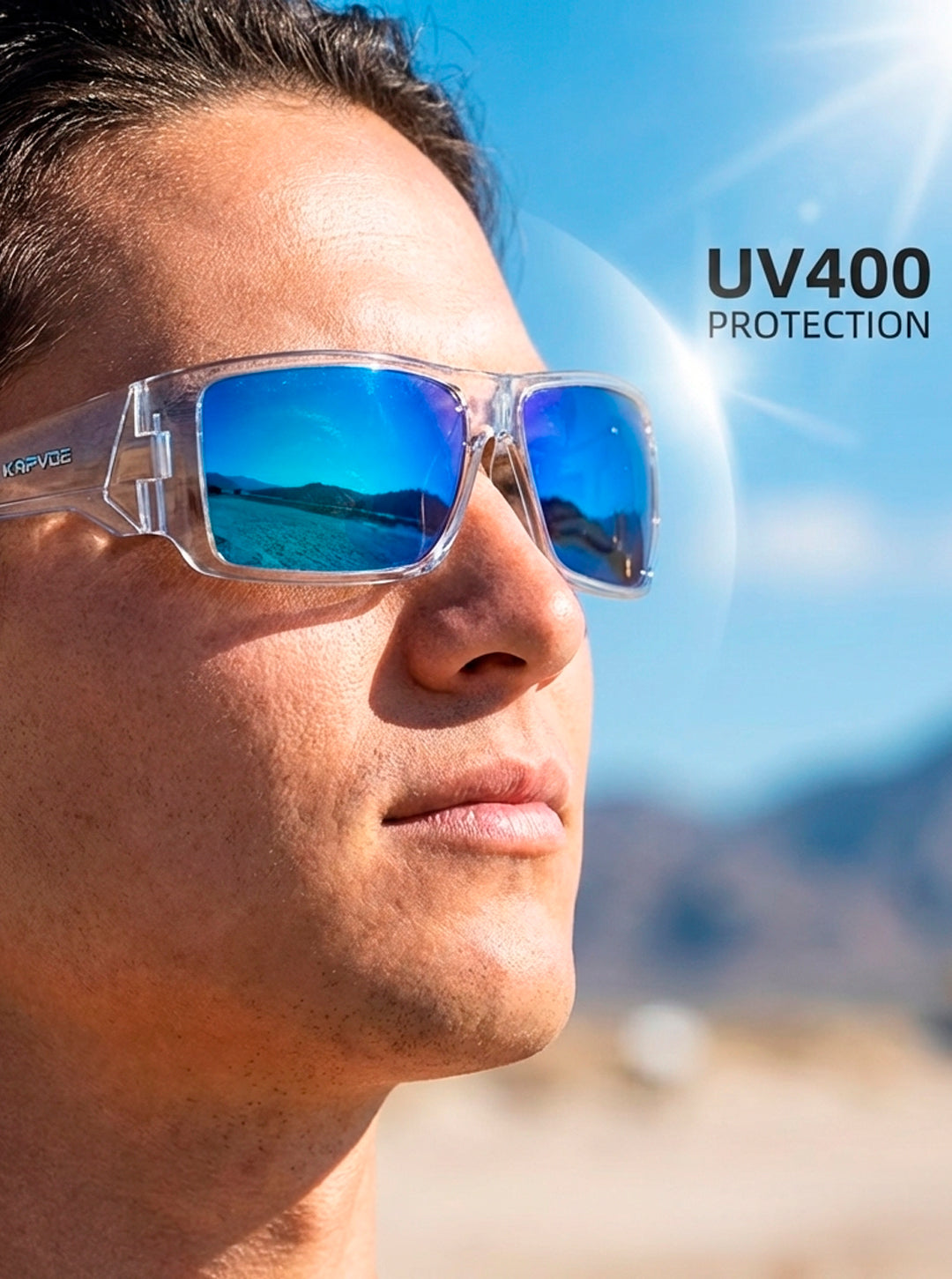 As lentes bloqueiam os raios solares nocivos, ajudando a proteger os olhos durante atividades prolongadas sob sol forte e vento constante.